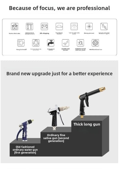 With 5 meter hoses/water pipe High Pressure Metal Spray Gun Water gun spray type: Straight, water column, shower ,mist High-pressure water gun, absolute high quality, metal barrel and rubberized handle, comfortable to use Usage scenarios: watering flowers, washing floors, washing balconies, washing cars